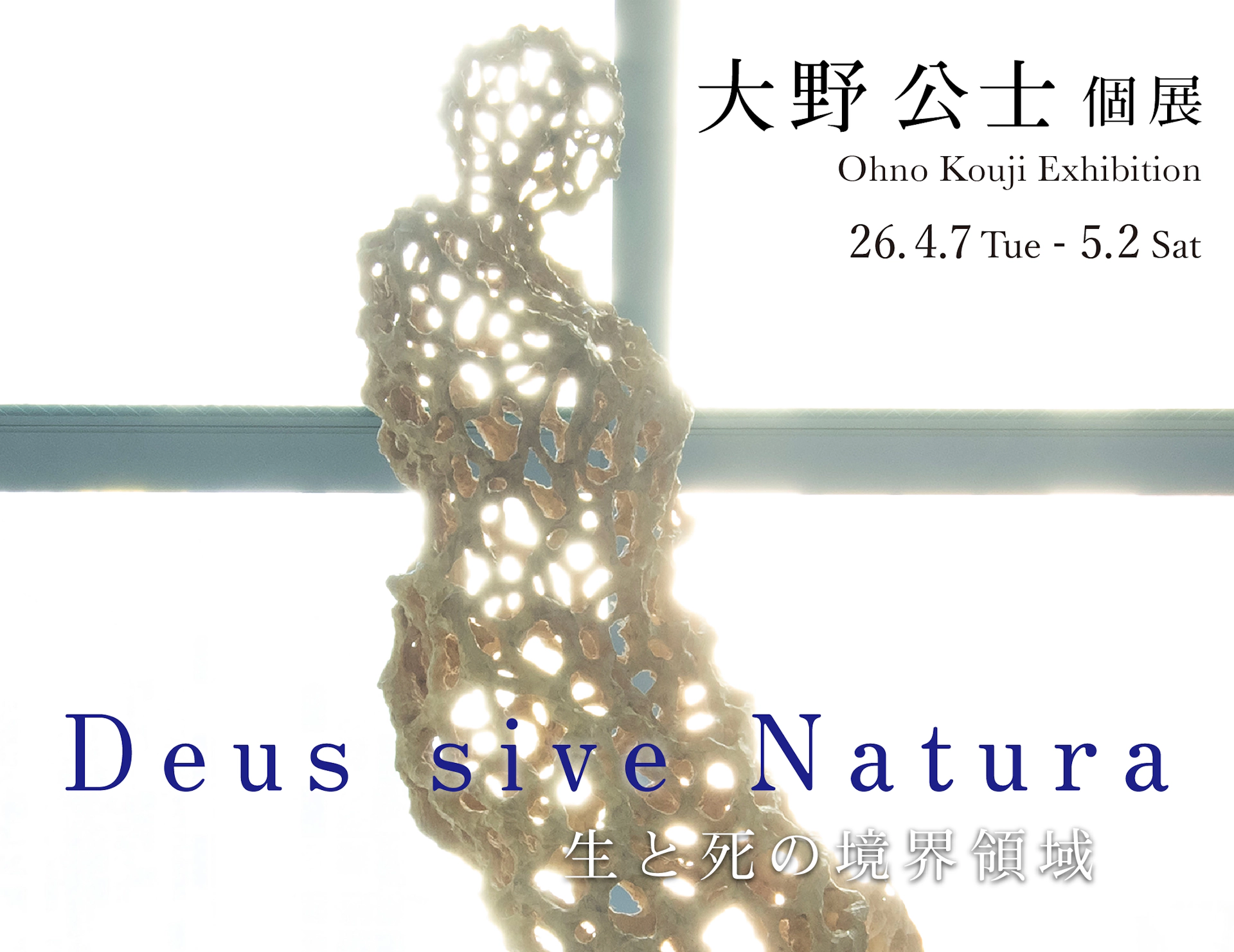 大野のアーティストとしての活動の一つの節目となる本展にて、スピノザの「神即ち自然」という命題を起点として、長年にわたり探究してきた死生観と存在への考察の成果をぜひご体感ください。