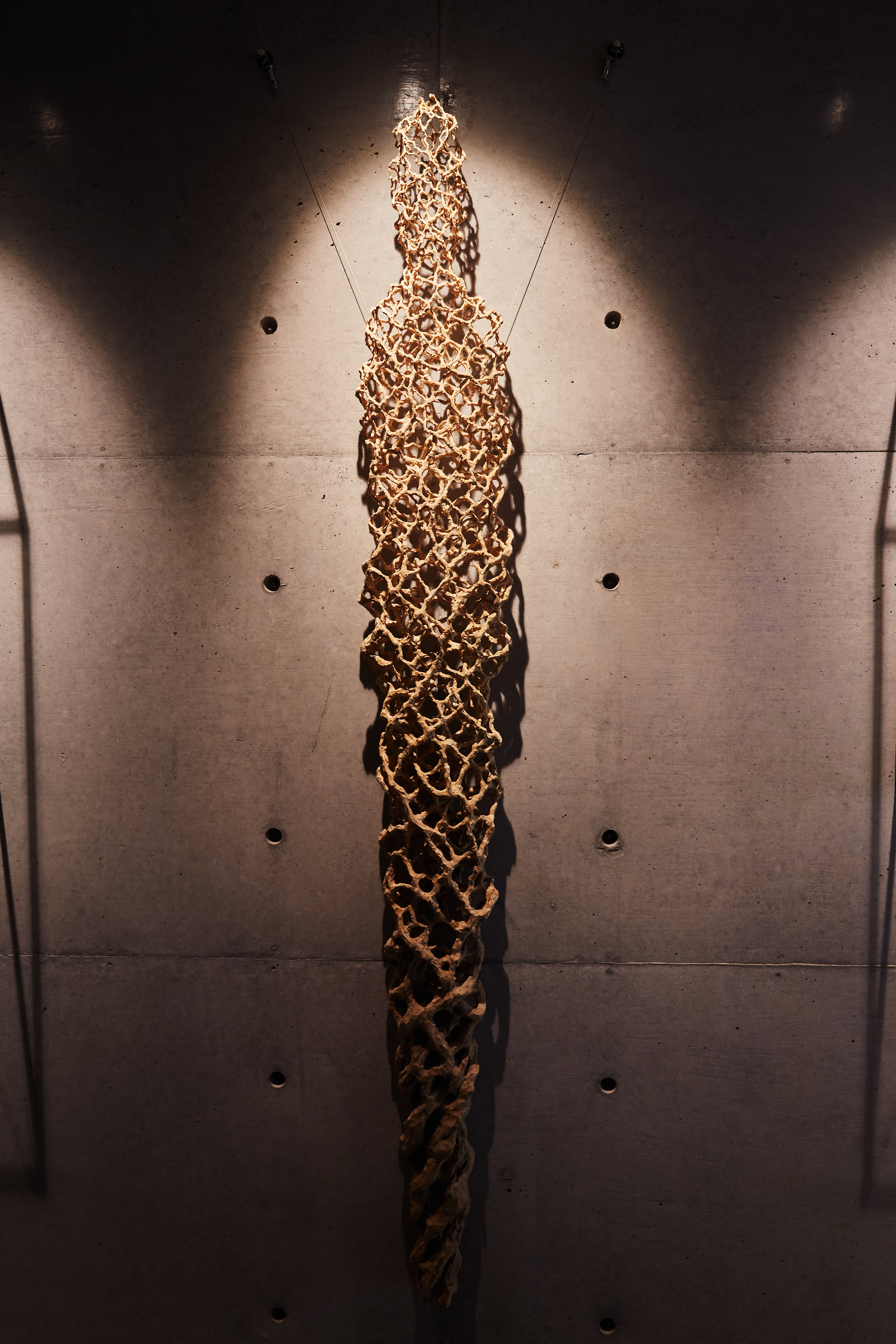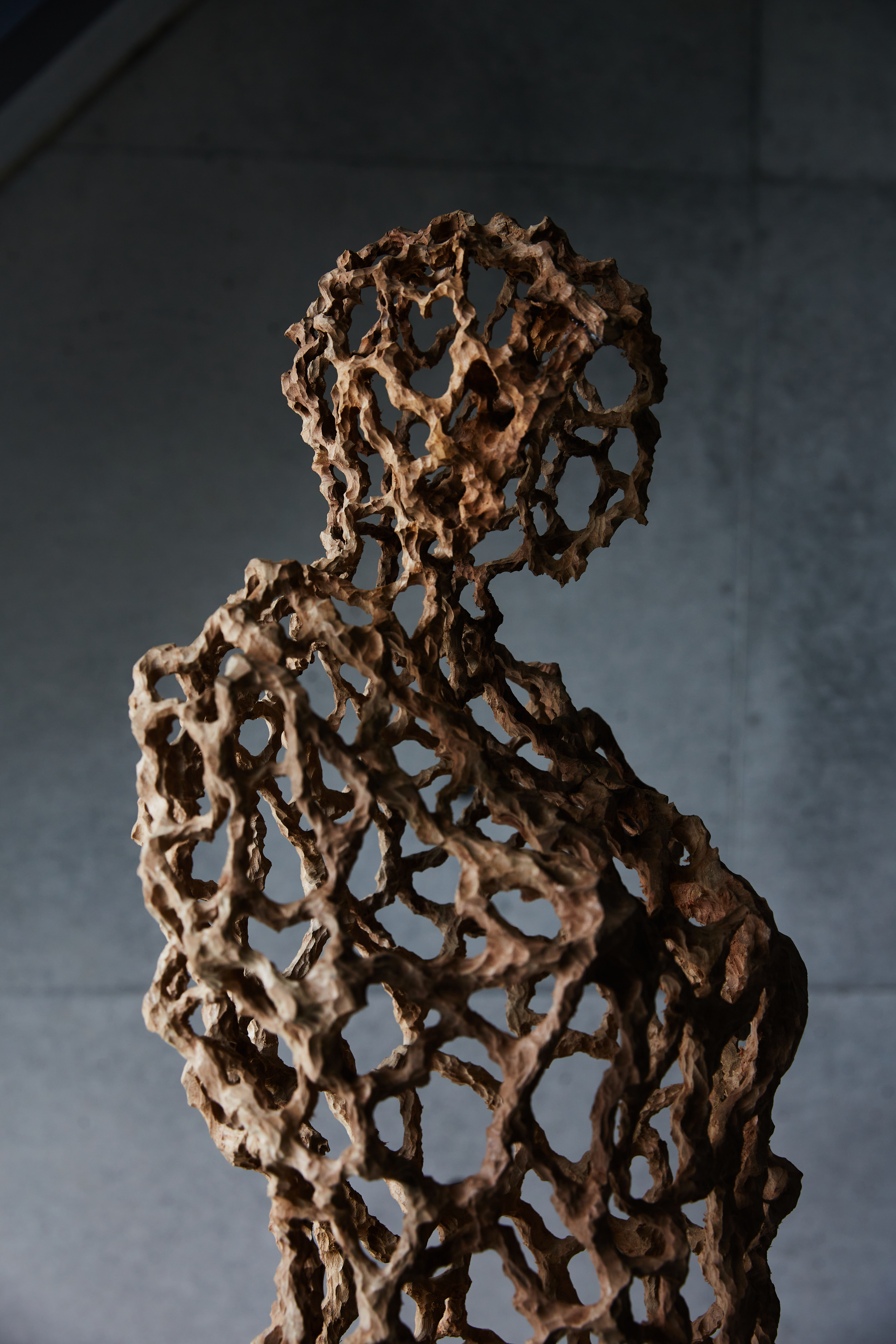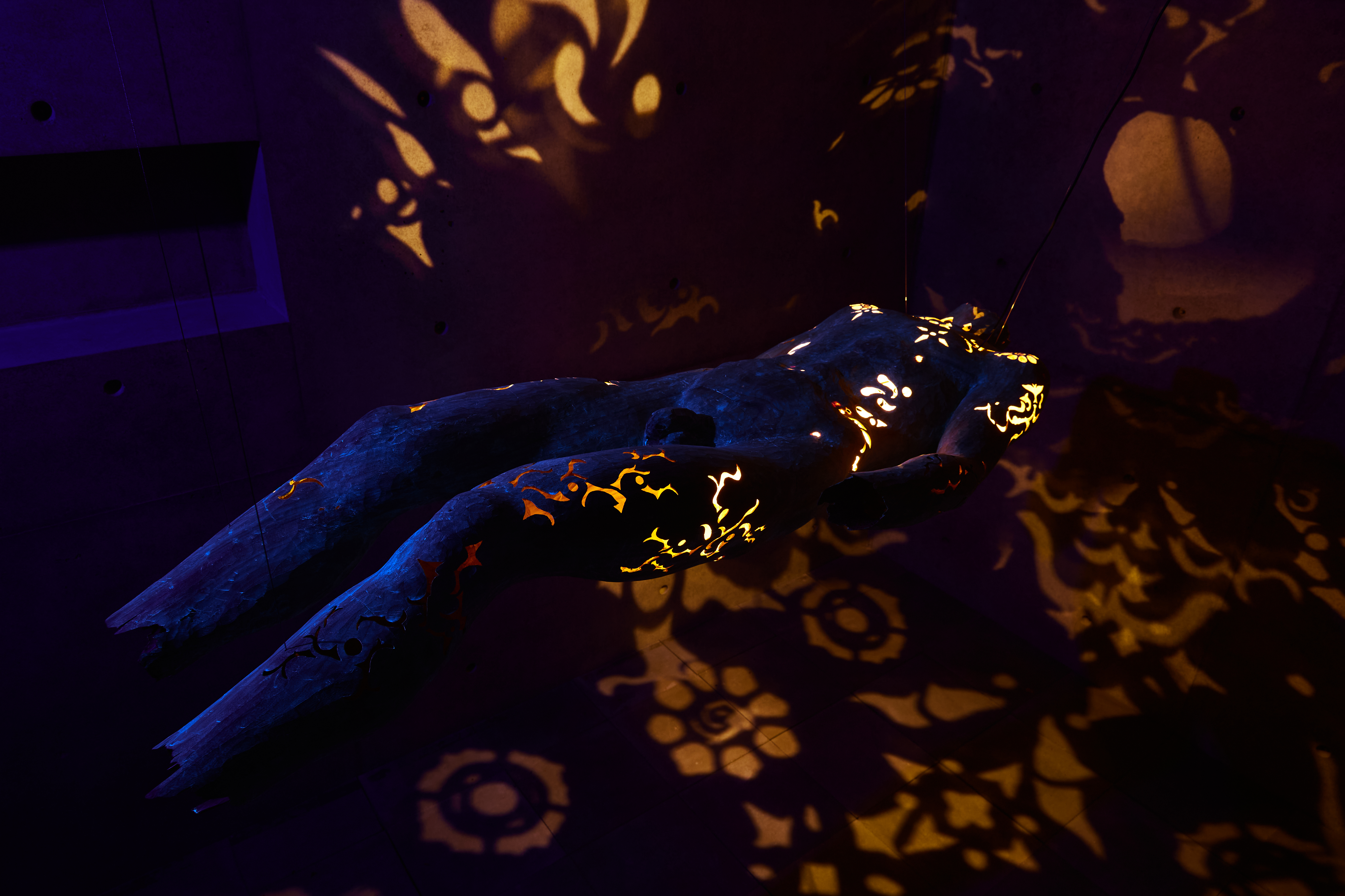 その表現における一貫したコンセプトである、生と死の関係性や世界の存在についての探究は、東洋的なインド哲学や仏教哲学から、ギリシャを発端とする実存を主眼においた西洋哲学、量子論をはじめとする物理学まで多岐にわたります。その探究の成果としての表現は、木彫を極限まで中空に彫り抜いた立体作品や、廃材を使用した大型の野外彫刻、絹糸を一本ずつ結んでUVライトで発光させるインスタレーションなど、様々な素材を使用した多彩な空間構成として結実します。