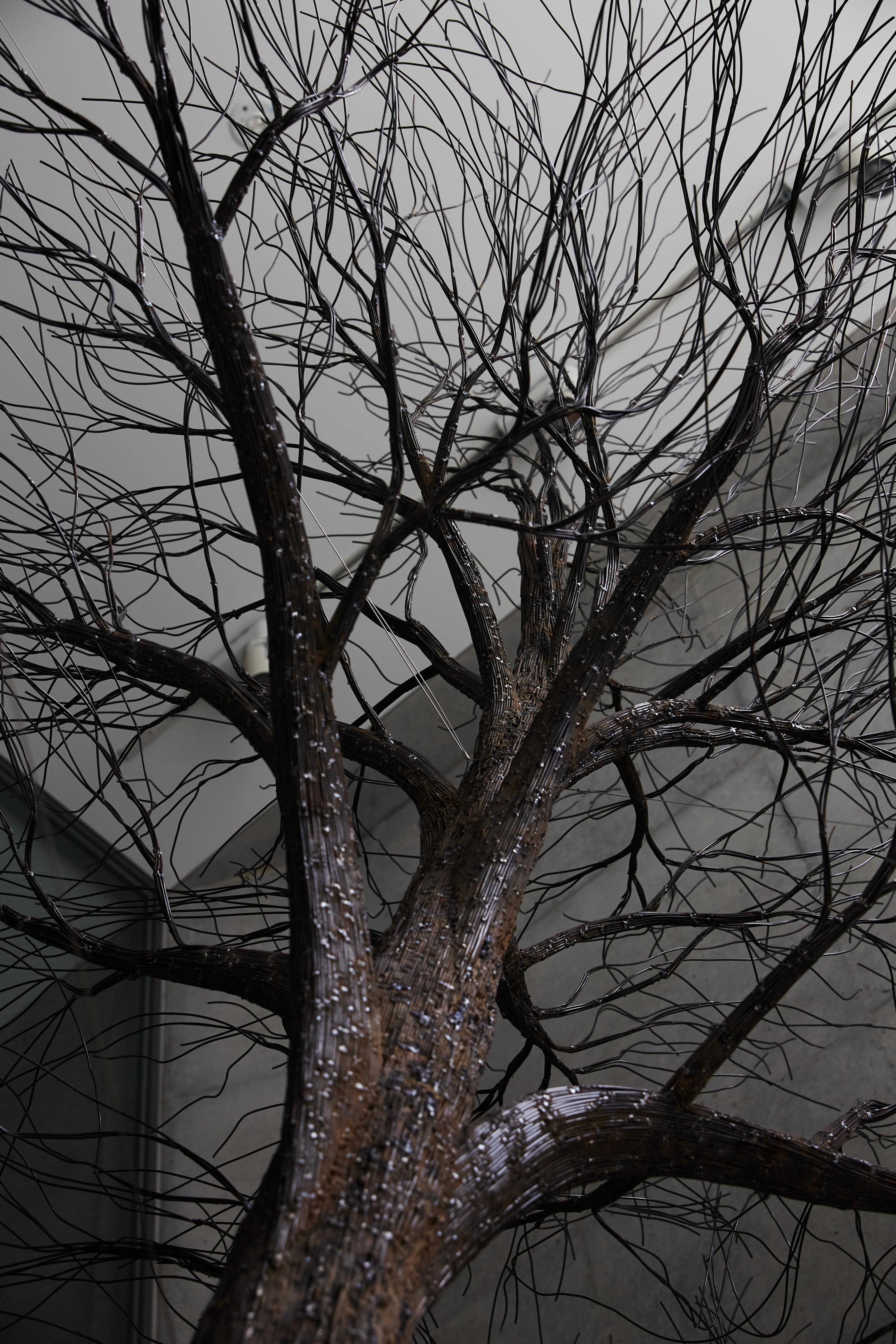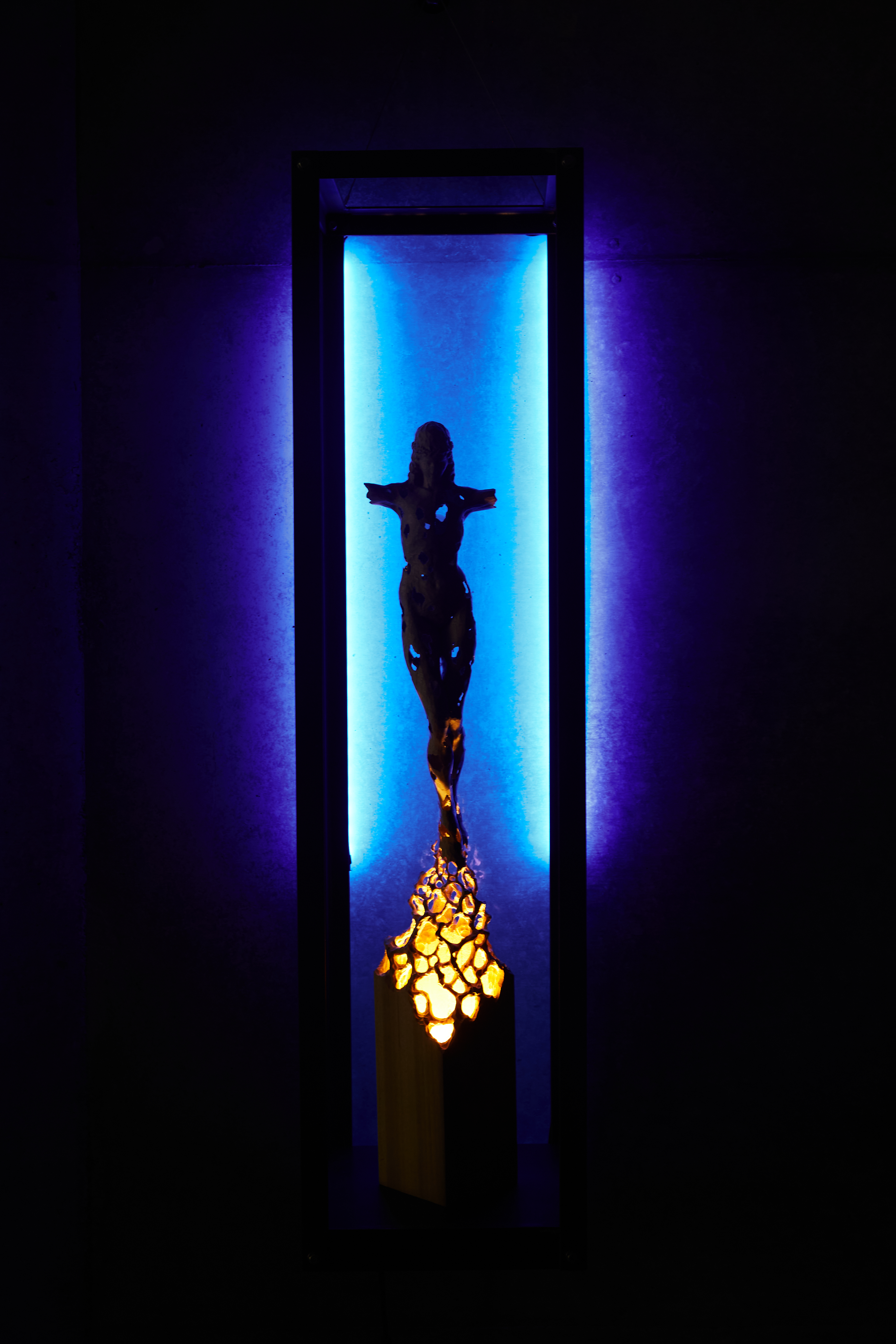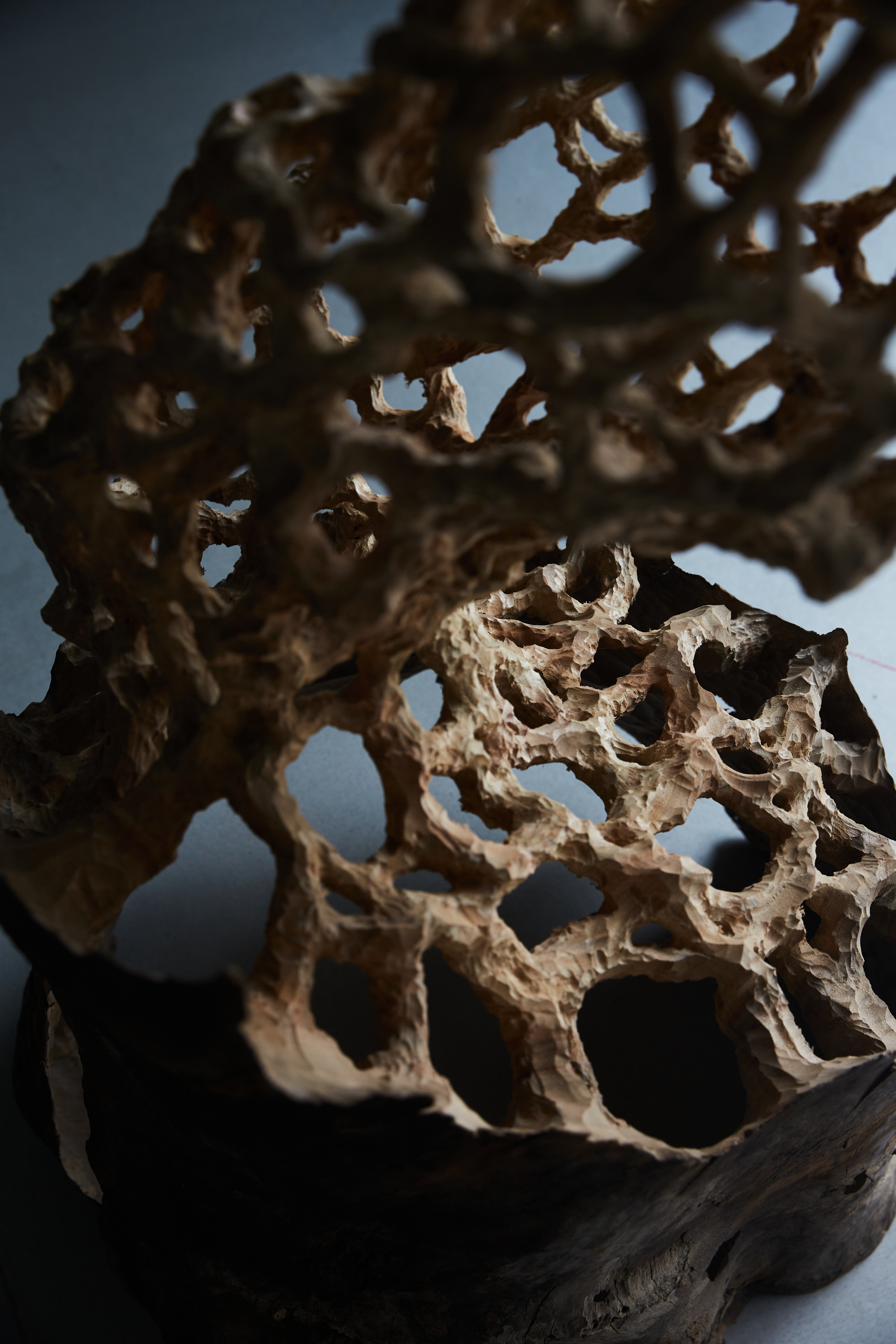 その表現における一貫したコンセプトである、生と死の関係性や世界の存在についての探究は、東洋的なインド哲学や仏教哲学から、ギリシャを発端とする実存を主眼においた西洋哲学、量子論をはじめとする物理学まで多岐にわたります。その探究の成果としての表現は、木彫を極限まで中空に彫り抜いた立体作品や、廃材を使用した大型の野外彫刻、絹糸を一本ずつ結んでUVライトで発光させるインスタレーションなど、様々な素材を使用した多彩な空間構成として結実します。