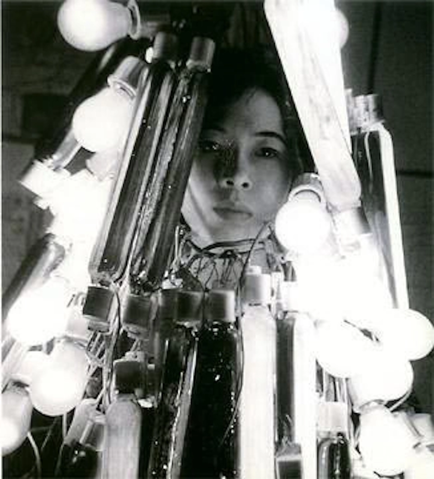 田中敦子、1932年大阪府生まれ。日本の美術家。「具体美術協会」の主要なメンバーの1人として活躍し、電飾を身にまとう「電気服」を制作。そしてそれを絵画化するようになると、生涯に渡って同じテーマに取り組み続けた。フランスの美術批評家ミシェル・タピエ氏の目に留まり高く評価され、以降国内外で評価され、日本でも1980年代より再評価が進み、近年更なる注目を集め、草間彌生、オノヨーコに並ぶ偉才と評された。