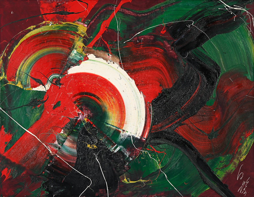 白髪一雄、1924年兵庫県生まれ。日本の抽象画家。52年に村上三郎、金山明、田中敦子と「0会」を結成、55年には戦後日本の前衛芸術を牽引したアーティスト集団前衛芸術グループ「具体美術協会」に村上らとともに参加し、具体美術協会の中心メンバーとして知られています。フット・ペインティングという前例のない独特の制作方法で生み出された白髪一雄の作品は、海外からも高い評価を得ています。