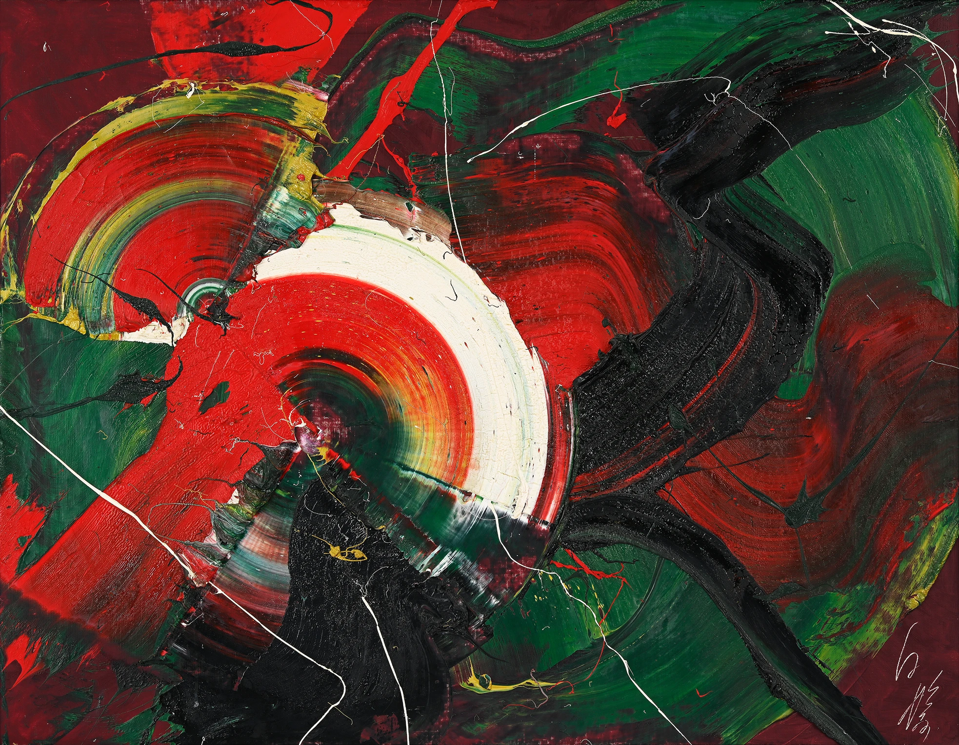 白髪一雄、1924年兵庫県生まれ。日本の抽象画家。52年に村上三郎、金山明、田中敦子と「0会」を結成、55年には戦後日本の前衛芸術を牽引したアーティスト集団前衛芸術グループ「具体美術協会」に村上らとともに参加し、具体美術協会の中心メンバーとして知られています。フット・ペインティングという前例のない独特の制作方法で生み出された白髪一雄の作品は、海外からも高い評価を得ています。