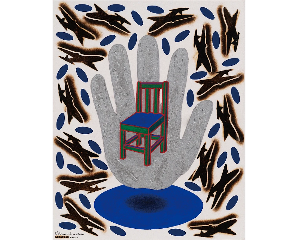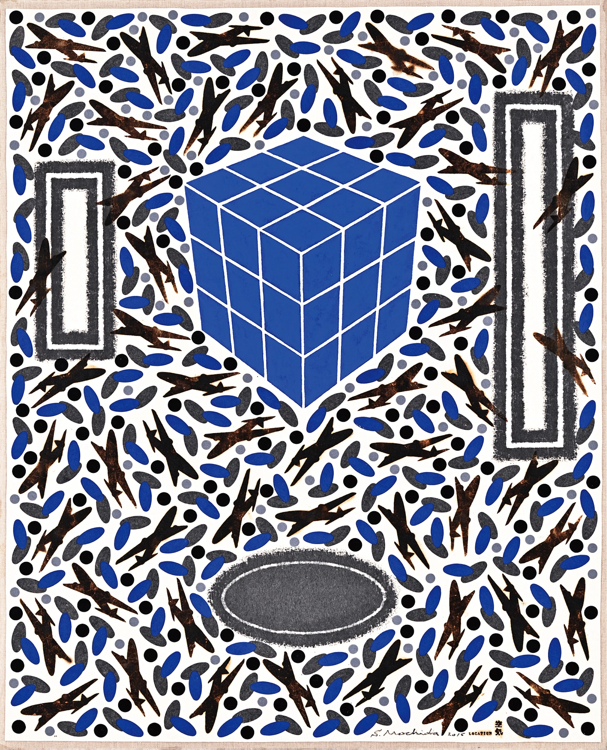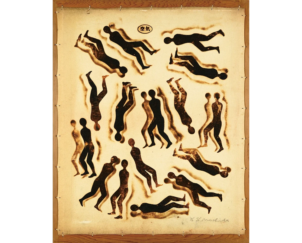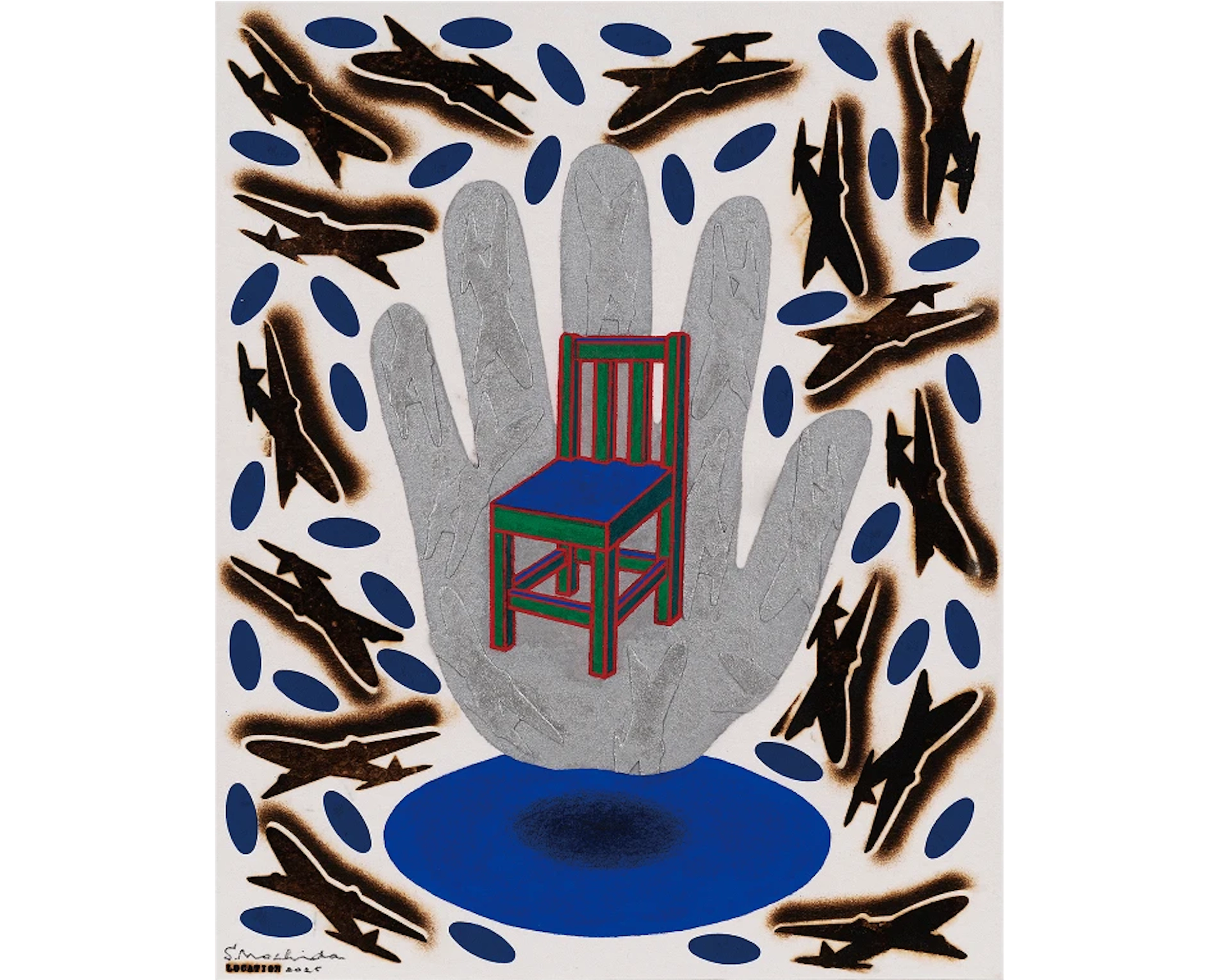 持田総章、1934年東京都生まれ。版画家、大阪芸術大学の名誉教授。関西エリアの代表的な現代美術グループである「Ge」に所属、メインメンバーとして活動を行なっている。制作のテーマであるLOCATIONシリーズ「空気」は、長年の継続したコンセプトである。基底材のフェルトを加熱・炭化する事で、フェルトに内包されている空気を遮断もしくは拒絶する。この焼き印 (brand) を押す行為が、制作の主たる作業である。空気の含む所と含まない所、空気の内包と拒絶が画面を構成している。 モチーフは飛行機で、子供の頃に誰もが一度は夢に見た飛行は現実のものとなり、人間は時空の観念の変革を余儀なくされた。飛行の実現は想像と幻想を実体化し、新しい認識と行動に利便性をもたらしたが、一方でその実体は決して「平和利用」のみのものでなく、「戦争に使われている」現実がある。この選択は我々自身にゆだねられている。