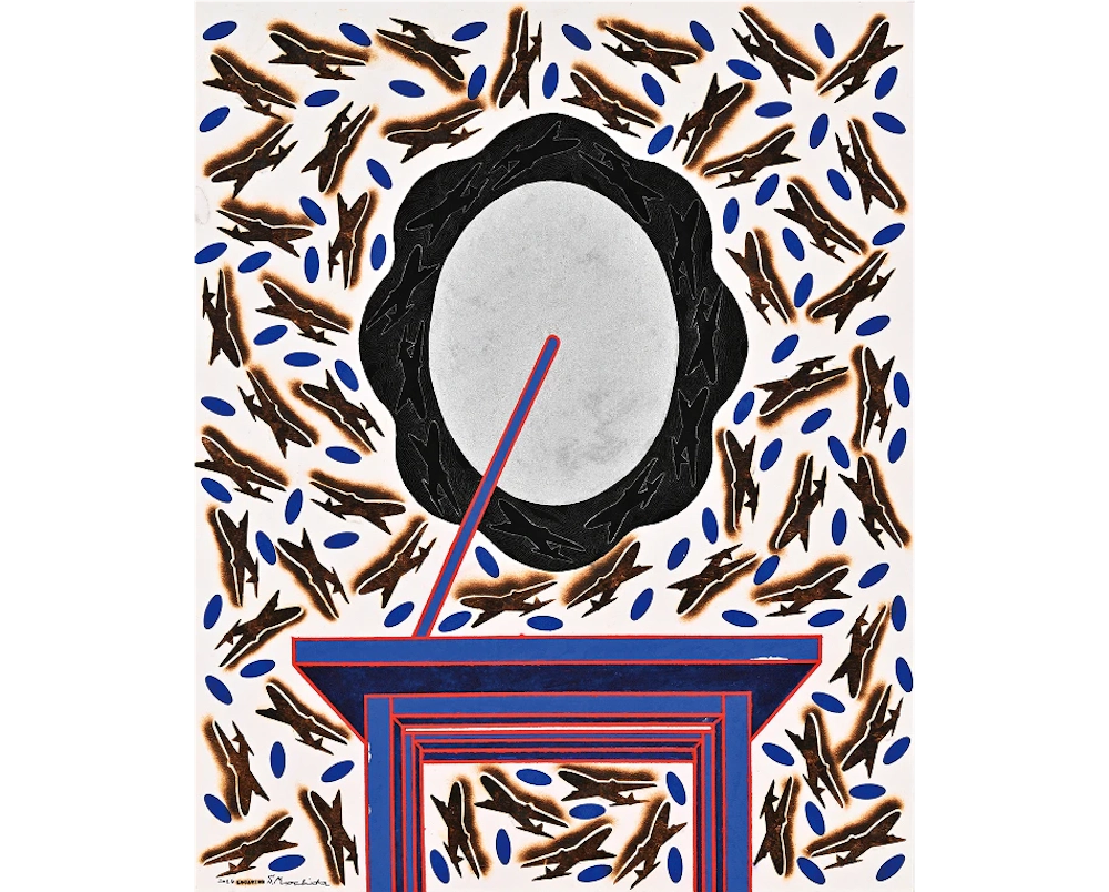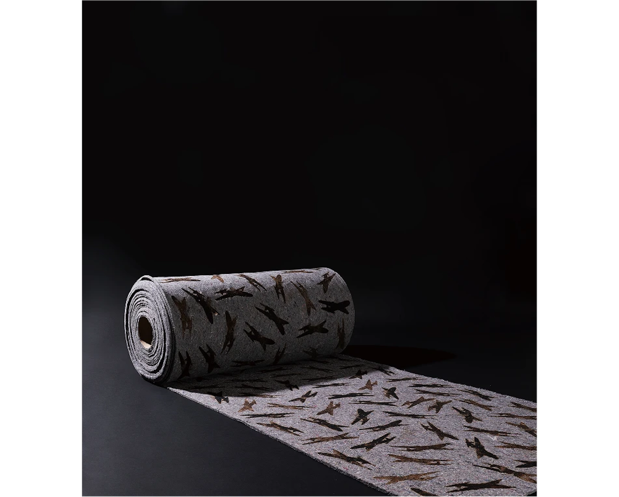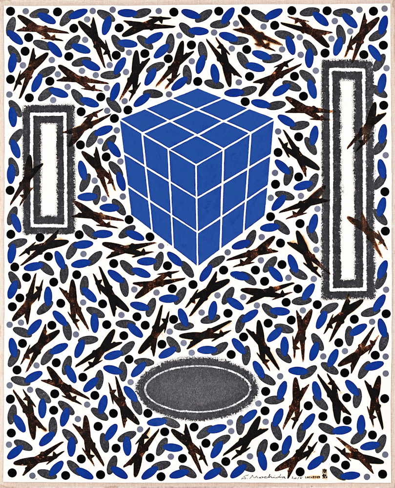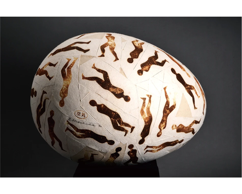 持田総章、1934年東京都生まれ。版画家、大阪芸術大学の名誉教授。関西エリアの代表的な現代美術グループである「Ge」に所属、メインメンバーとして活動を行なっている。制作のテーマであるLOCATIONシリーズ「空気」は、長年の継続したコンセプトである。基底材のフェルトを加熱・炭化する事で、フェルトに内包されている空気を遮断もしくは拒絶する。この焼き印 (brand) を押す行為が、制作の主たる作業である。空気の含む所と含まない所、空気の内包と拒絶が画面を構成している。 モチーフは飛行機で、子供の頃に誰もが一度は夢に見た飛行は現実のものとなり、人間は時空の観念の変革を余儀なくされた。飛行の実現は想像と幻想を実体化し、新しい認識と行動に利便性をもたらしたが、一方でその実体は決して「平和利用」のみのものでなく、「戦争に使われている」現実がある。この選択は我々自身にゆだねられている。