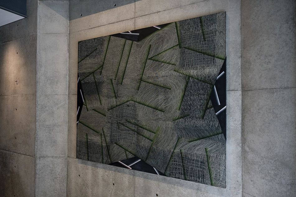 1960年代には〈人体〉を主題とし、生命の有機的なかたちと無機的な構造物を対置させ、スプレー技法による圧迫された身体像を通じて、存在の緊張と葛藤、動と静の相克を描きました。1975年の渡米を契機に、守谷のまなざしは次第に絵画の根源的な構成要素である「線」「面」「色面」へと向かい、表現は抽象へと深化していきます。80年代以降、スクラッチ技法で絵具層を削り出し、線の反復や集積によって時間や記憶の痕跡を刻む《作品》や《跡》シリーズを展開。さらに、秩序とわずかなズレが静かなリズムを生む《列》、古代の円墳や霊廟の建築的記憶を幾何学的形態に昇華した《廟》シリーズへとその探求は広がりました。守谷の作品には一貫して「物質と行為」「記憶と時間」「構築と痕跡」が交錯し、その探究の歩みは、到達することのない理想郷に向かって続く果てなき旅そのものです。
